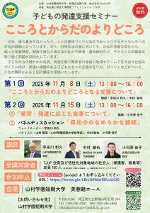 山村学園短期大学・武蔵丘短期大学・株式会社SHUHARI・TJUPで開催する「こころとからだのよりどころ」セミナーでは、幼児期、児童期における発達に課題のある子どもたちへの支援の在り方や食育の在り方などについて理解し、子どもたちの「ウェルビーイング」だけでなく、かかわり手の「ウェルビーイング」の向上を目的とした内容の講義を2回に分けて講義いたします。